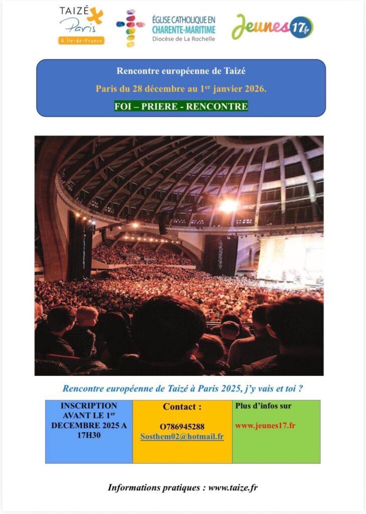 La prochaine Rencontre Européenne de Taizé aura lieu à Paris et en Île-de-France du 28 décembre 2025 au 1er janvier 2026.